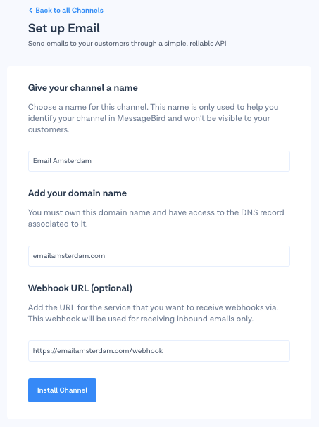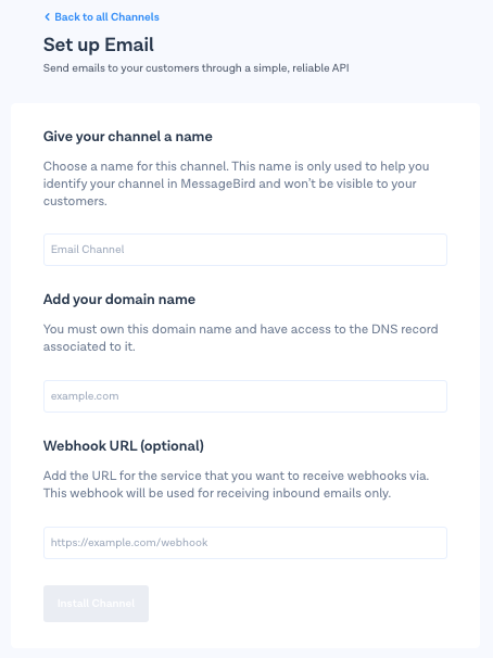**Note:** The Custom Email channel is only included in the [Professional Custom Plan](https://www.messagebird.com/pricing).\ <br>