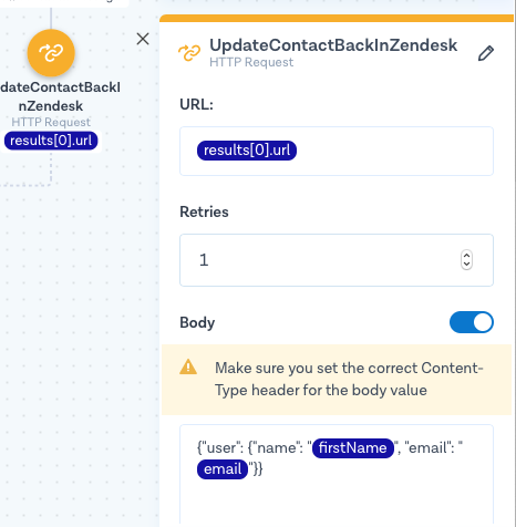* The payload (body) follows the format described in the [Zendesk documentation](https://developer.zendesk.com/rest_api/docs/support/users#update-user). In our case, we will be updating the *first name* and *email* fields