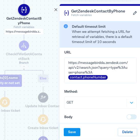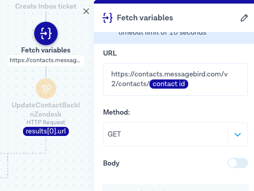 1\. Let’s make sure the flow has access to the latest Inbox contact information. We’ll add another **Http Fetch** step, make a call to the V2 version of the [Contacts API](https://contacts.messagebird.com/v2/contacts/), and pass the contact ID.