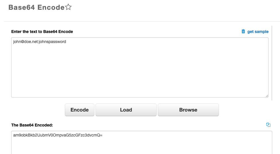 4\. As a preliminary step, we will need to Base64 encode the *user:password* parameter. Using <https://codebeautify.org/base64-encode>. It will look something like this:&#x20;