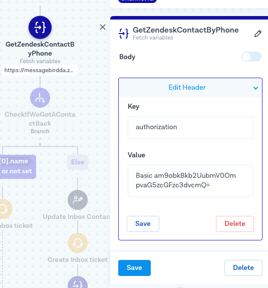 3\. Since the Zendesk API requires user and password authorization, we need to convert that to something Flow Builder understands, meaning an Authorization header with Basic authorization.