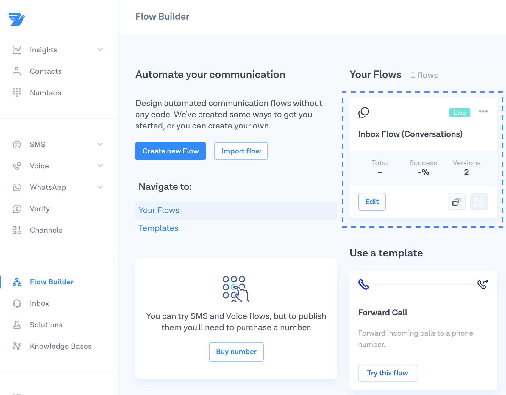 1\. Go to [Flow Builder](https://dashboard.messagebird.com/en/flow-builder) and choose the **Inbox Flow (Conversations)** flow.<br>