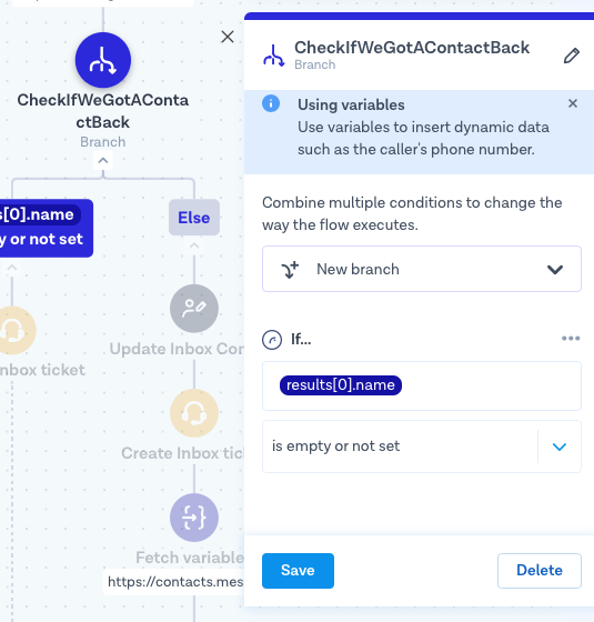 We will add another branch step and check if we got any results from Zendesk (if not then there is nothing to inform Inbox about.<br>