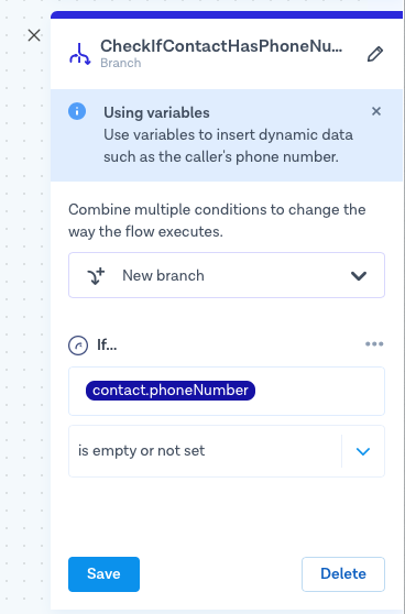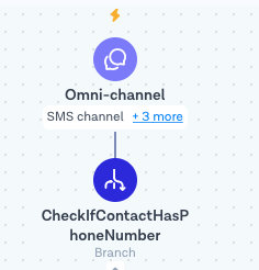 1\. Add a **Branch** step to the flow and check if there’s a phone number associated with the contact (meaning that the conversation is happening over a channel that has a phone number as an ID, like SMS or WhatsApp).
