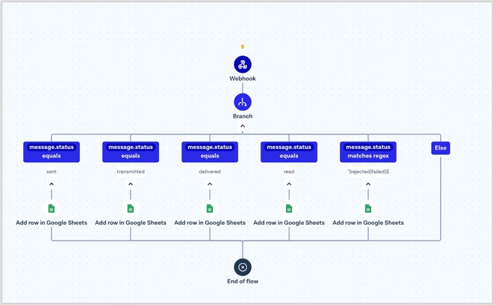Go to Flow Builder and configure the imported flow. Click Add row in Google Sheets step to connect the Google Sheets and define the variables for all the columns. Repeat the steps for each status. For sent, transmitted, delivered, and read statuses: Column A - Time - {{currentTime}} Column B - MessageID - {{message.id}} Column C - To - {{message.from}} Column D - To - {{message.to}} Column E - Template Name - {{message.content.hsm.templateName}} Column F - Status - {{message.status}} For rejected and error status: Column A - Time - {{currentTime}} Column B - MessageID - {{message.id}} Column C - To - {{message.from}} Column D - To - {{message.to}} Column E - Template Name - {{message.content.hsm.templateName}} Column F - Error Code - {{message.error.code}} Column G - Error Description - {{message.error.description}}