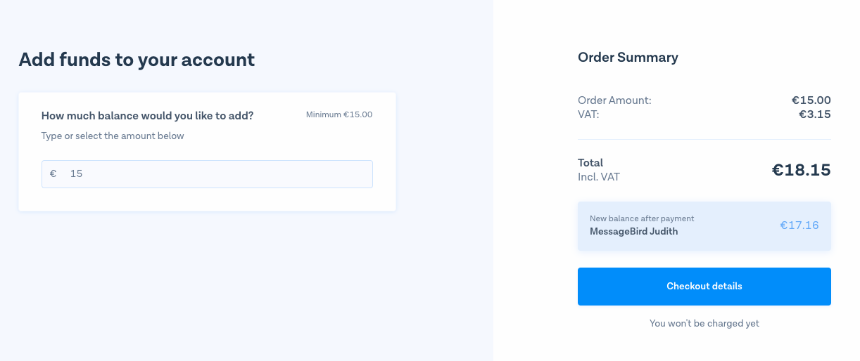 Under 'Add funds to your account', select the amount you want to top up. The minimum is 15€ and the maximum is 5.000€. On the right-hand side, you can see your order summary (amount plus VAT, if applicable).&#x20;