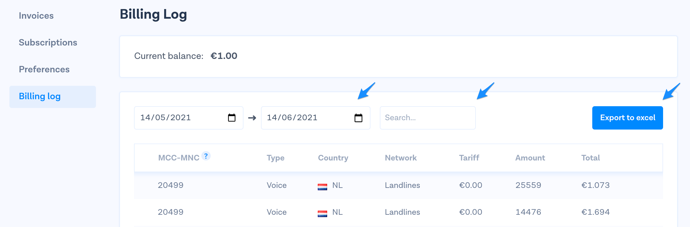 You have the option to filter and sort your usage for a specific period of time and can search per MCC-MNC. You are also able to export the data to an excel file.