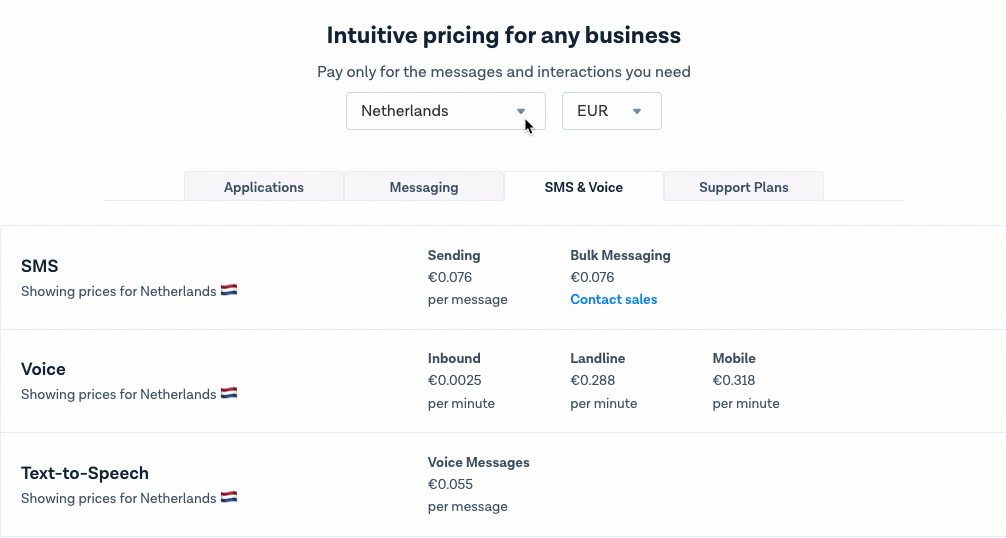 All of our pricing for SMS and Voice can be found [here](https://www.messagebird.com/en/pricing/) on our pricing page. You'll find an overview of our pricing for SMS, Voice Calling, Text to Speech, Numbers, and HLR.&#x20;