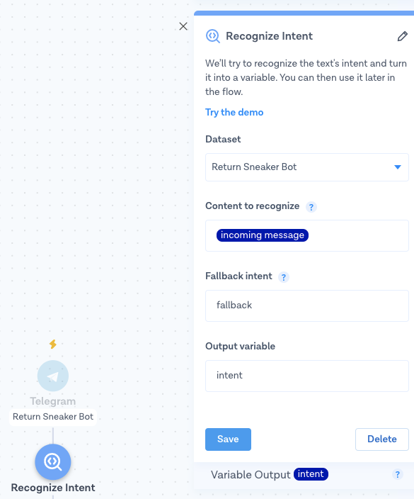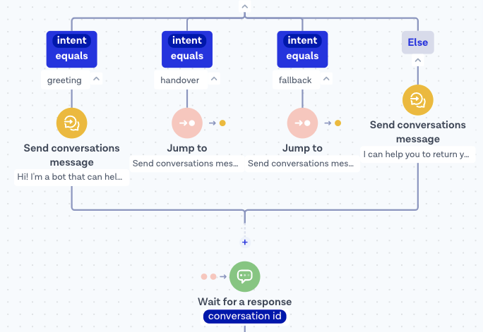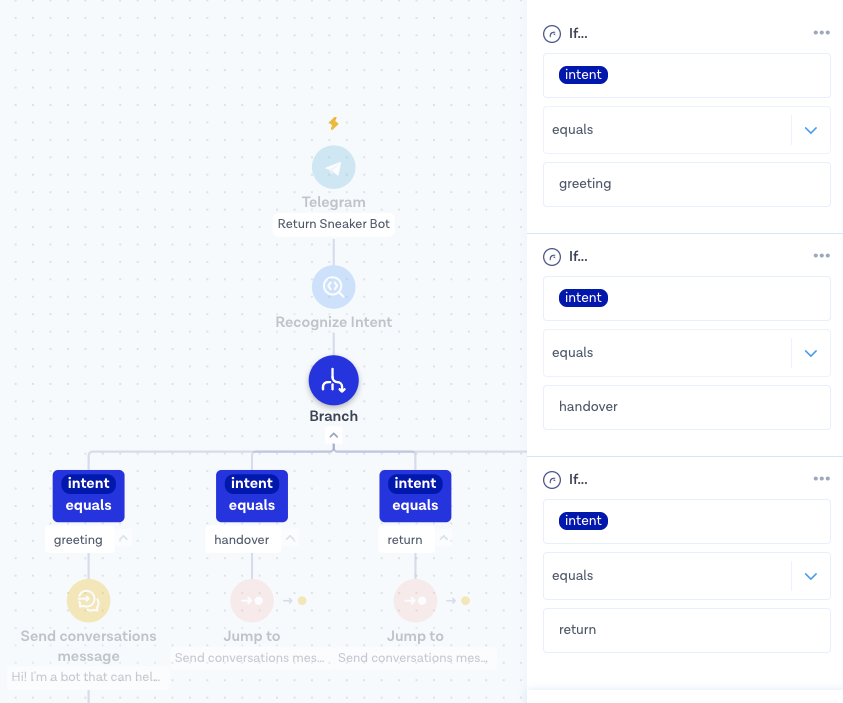 4. &#x20;If the detected intent is **return**, use the Else branch to reply with a message such as “Hi! I'm a bot that can help you to return your sneakers. Send us a photo of the bar code here. Let me know if you want me to forward you to an agent instead!”