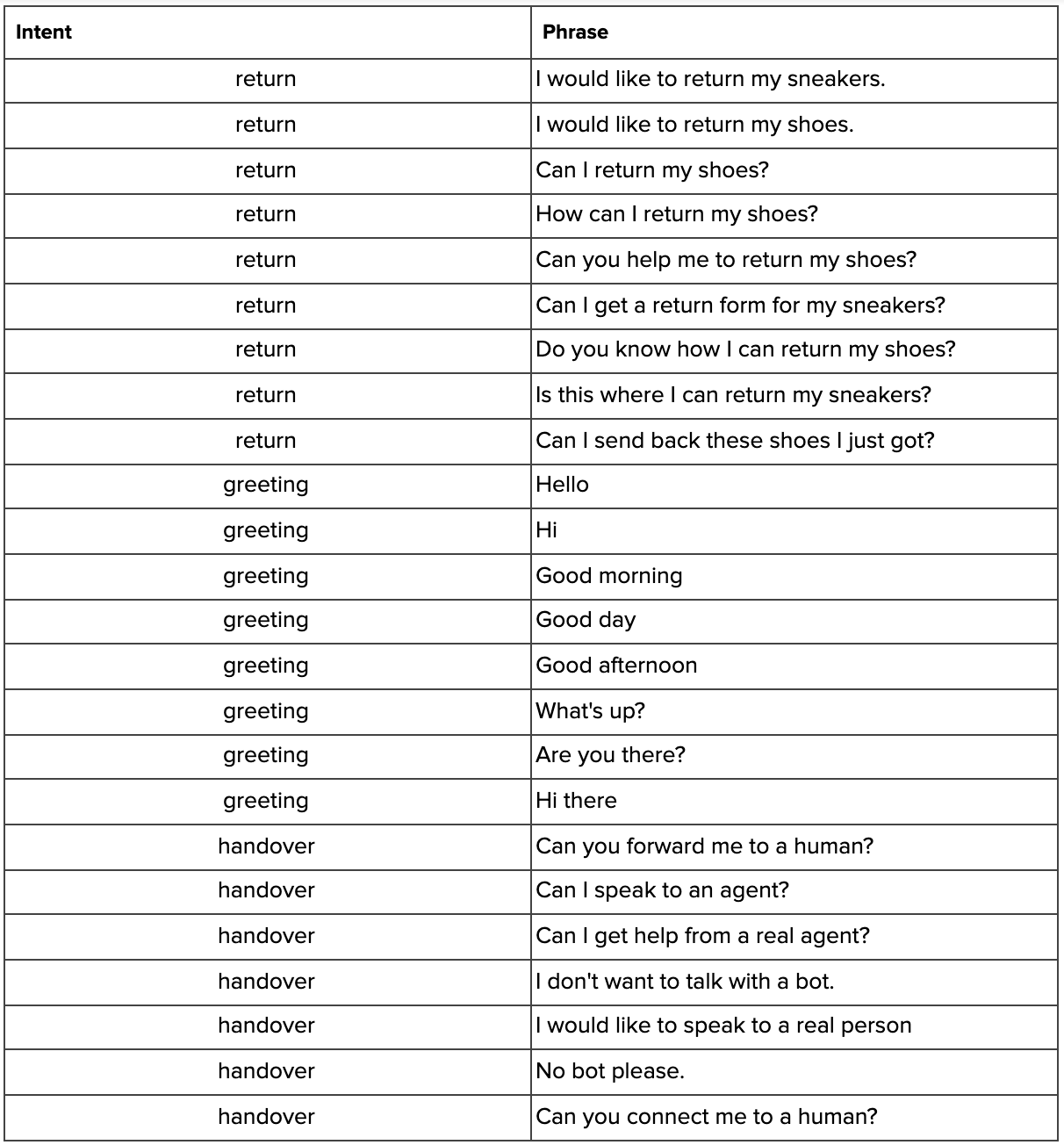 When designing your flow (and your intent knowledge base), try to imagine the conversations that will happen. These are some good starting points: