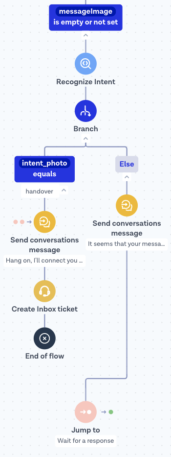 1. Check the intent of the message to see if the user asked to be forwarded. If so, set the flow to **Create Inbox ticket** so that a human agent can continue supporting the customer. Otherwise, you can instruct the customer with a message such as “It seems that your message did not contain an image. Please take a photo of the barcode on the package and share it here! If you want me to connect you to an agent, let me know!”.