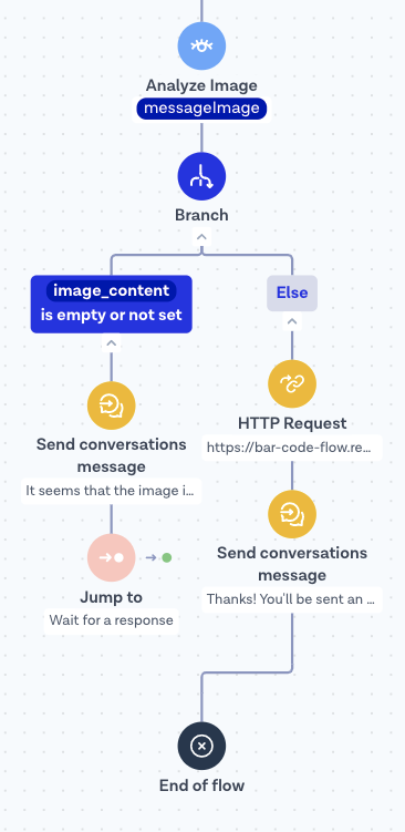 1. After putting it through the Analyze Image step, the output variable **{{image\_content}}** should contain the bar code. If this variable is empty, we’ll assume that the photo was unclear or that the image did not contain a bar code at all. In this case, we can inform the end-user and jump back to **Wait for response** to handle a follow-up photo. Jumping back also means that we can catch requests to be forwarded to an agent.&#x20;