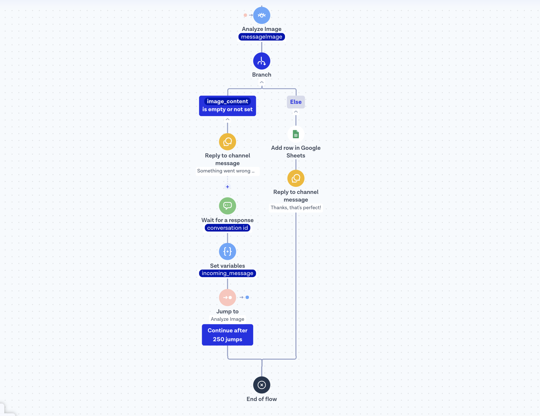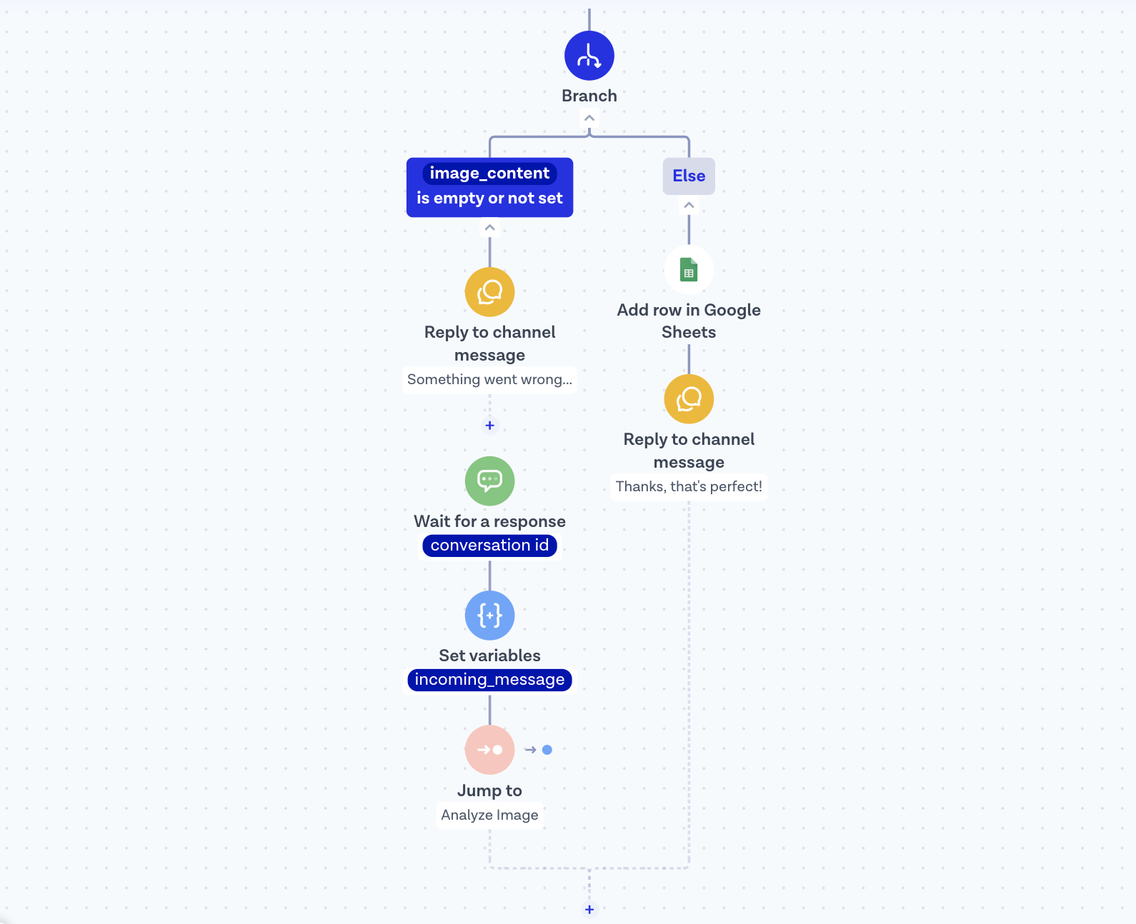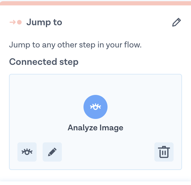 13. Finally, add a **Jump to** step below the **Set variables** step you just set up. This step will funnel any responses to the **Reply to channel message step** back to the **Analyze image** step so that the flow can try to detect and extract text from the user’s new photo.<br>