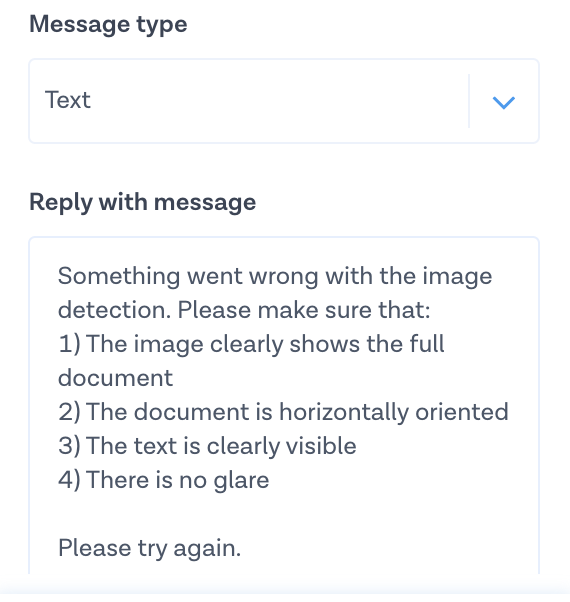6. Go to the step settings on the right-hand side. Select **Text** from the **Message type** drop-down menu, then add a helpful message to the **Reply with message** field. This message aims to get the user to send a new photo so that the text can be extracted!<br>