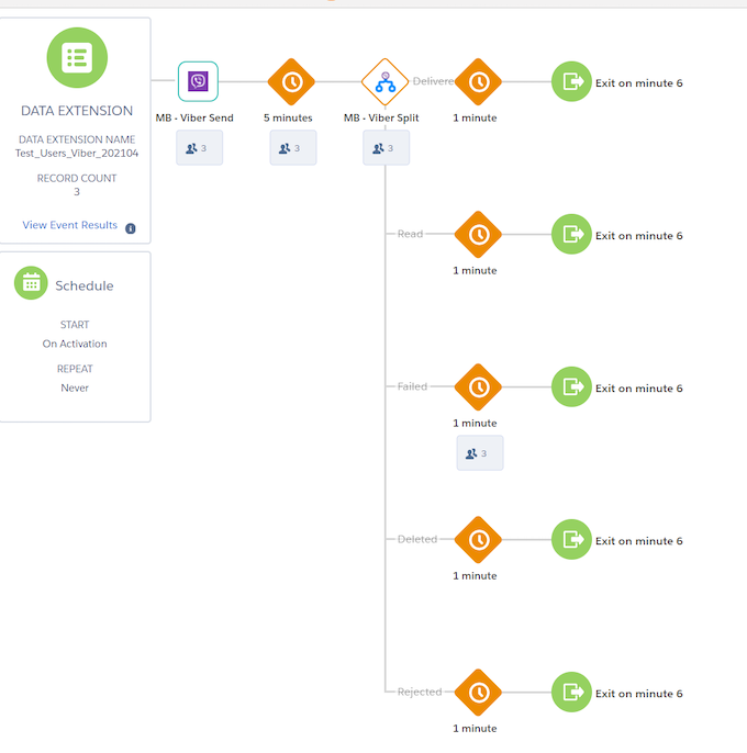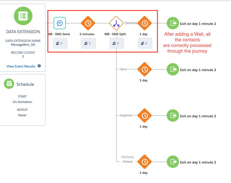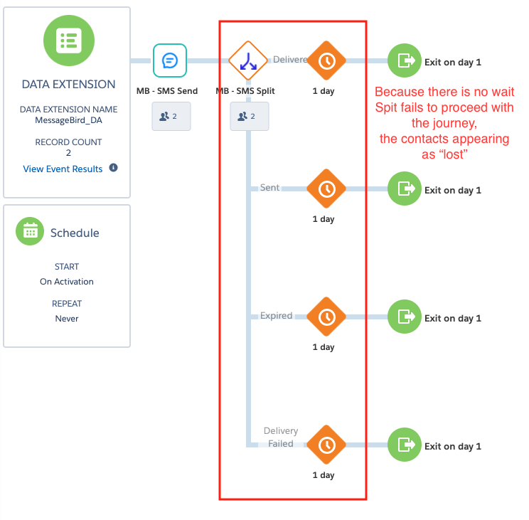 Sometimes the result for **Send** is returned really fast, that's why sometimes the journey works correctly even if we don't have a **Wait** step; however, in most cases, the journey will fail to proceed beyond the **Split** step.