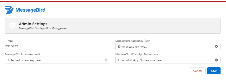 The connection settings (**API key and secret**) are stored individually for each business unit—this means that you will need to ensure that **each business unit is correctly configured** by going to **AppExchange** on the main navigation, selecting the **MessageBird (Demo)**, and clicking the **Admin Settings** blue button.