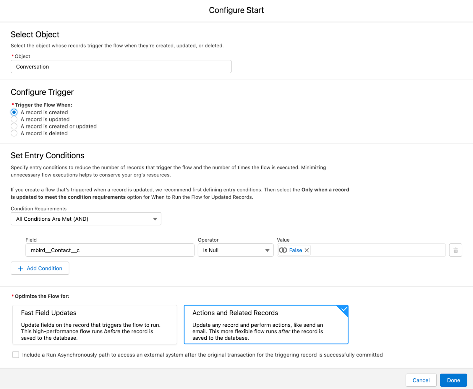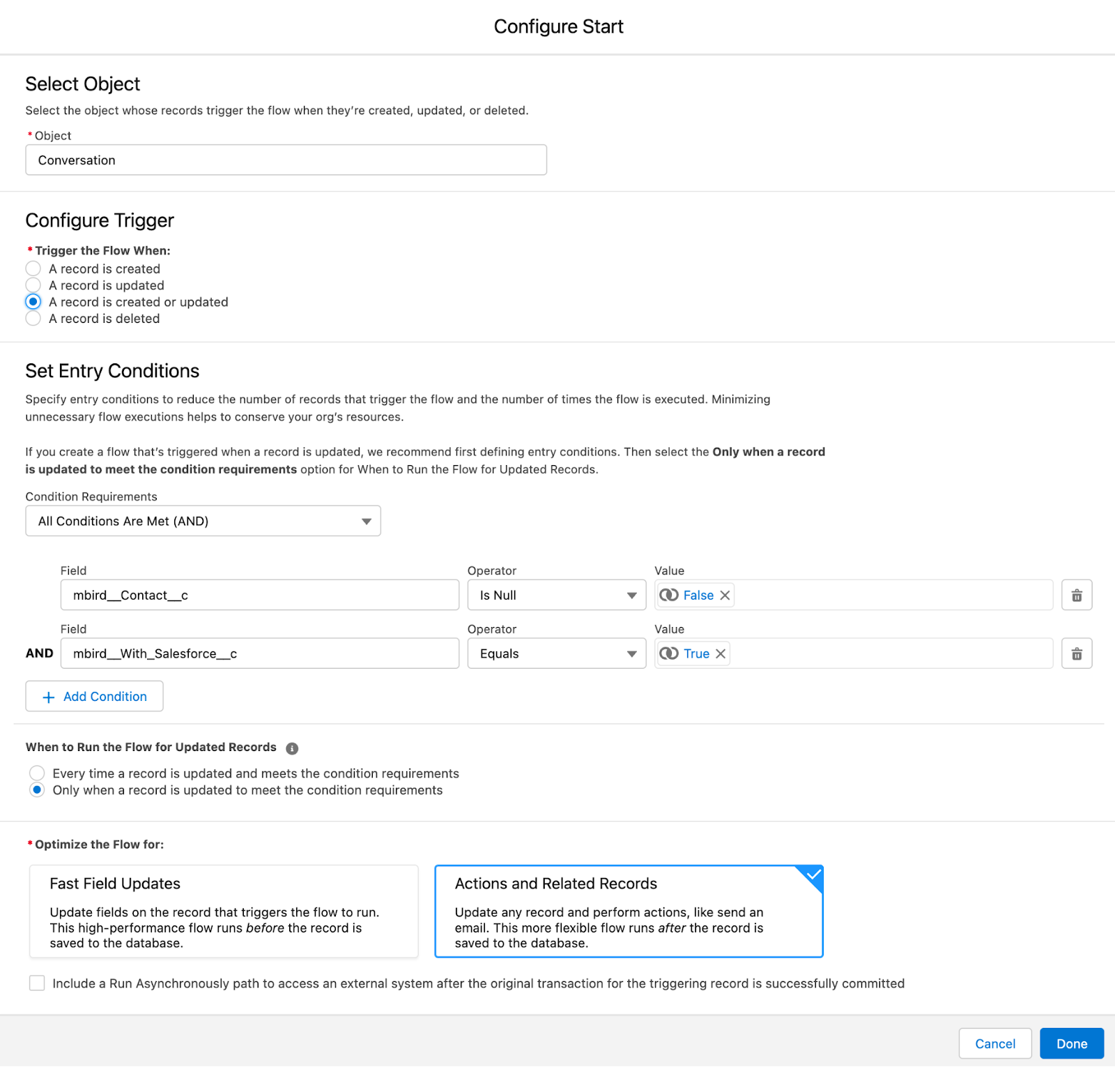 1. If you want to use Messagebird Flow Builder to mark conversations as [managed by ](https://docs.bird.com/connectivity-platform/basics/flowbuilder-steps-glossary#id-01g1jen5k3hqacptnejekwb75t)Salesforce, your trigger should be configured like this
