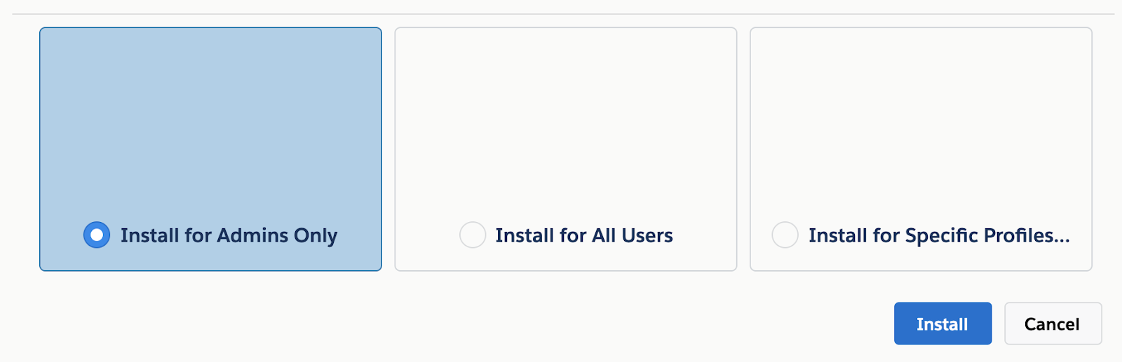 5. Installation details will be prompted, where you can define access for this package. This means defining which Business Units the users in the SFSSC account are able to use in this package. You can install it for Admins Only (recommended), for All Users, or for specific profiles. Select the option you want, click **Confirm**, then click **Install**!<br>