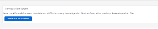 3. To create the force.com site, make sure that the site domain is already available and click **Continue to Setup screen**.<br>