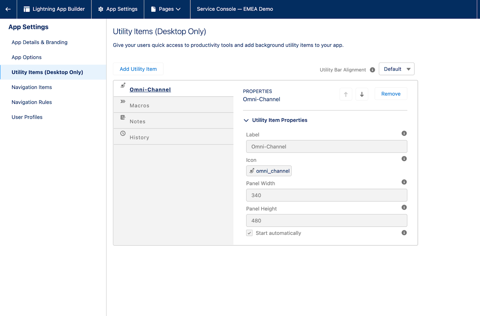 8. Enable the Omnichannel UI go to Setup->App Manager, select the app you use for Service Console and click on Edit. Inside click on Utility Items, add Utility Item and the Omni-channel.<br>