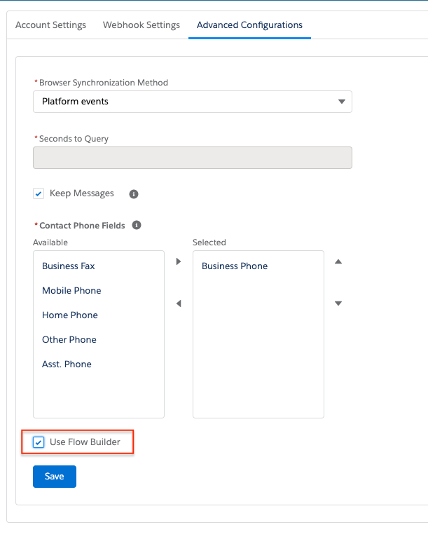 1. Inside the MessageBird’s package settings, under the advanced settings tab, ensure that the **Use Flow Builder** checkbox is enabled.<br>