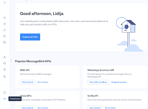 4. Now, you need to find your **Access Key** and **Signing Key**. Navigate to your [MessageBird Dashboard](https://dashboard.messagebird.com/) and click the [Developers](https://dashboard.messagebird.com/en/developers/settings) icon on the toolbar on the left-hand side of your screen.<br>