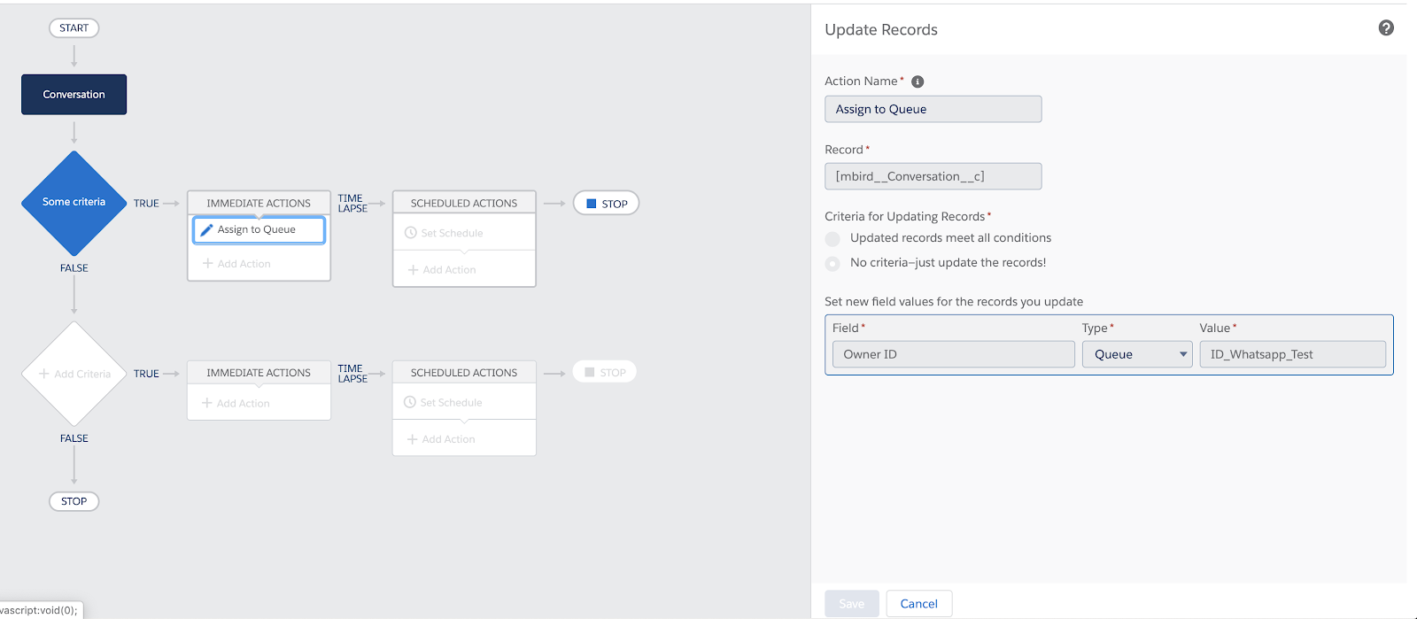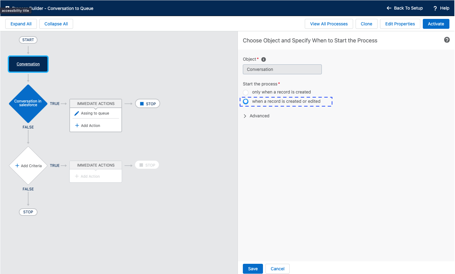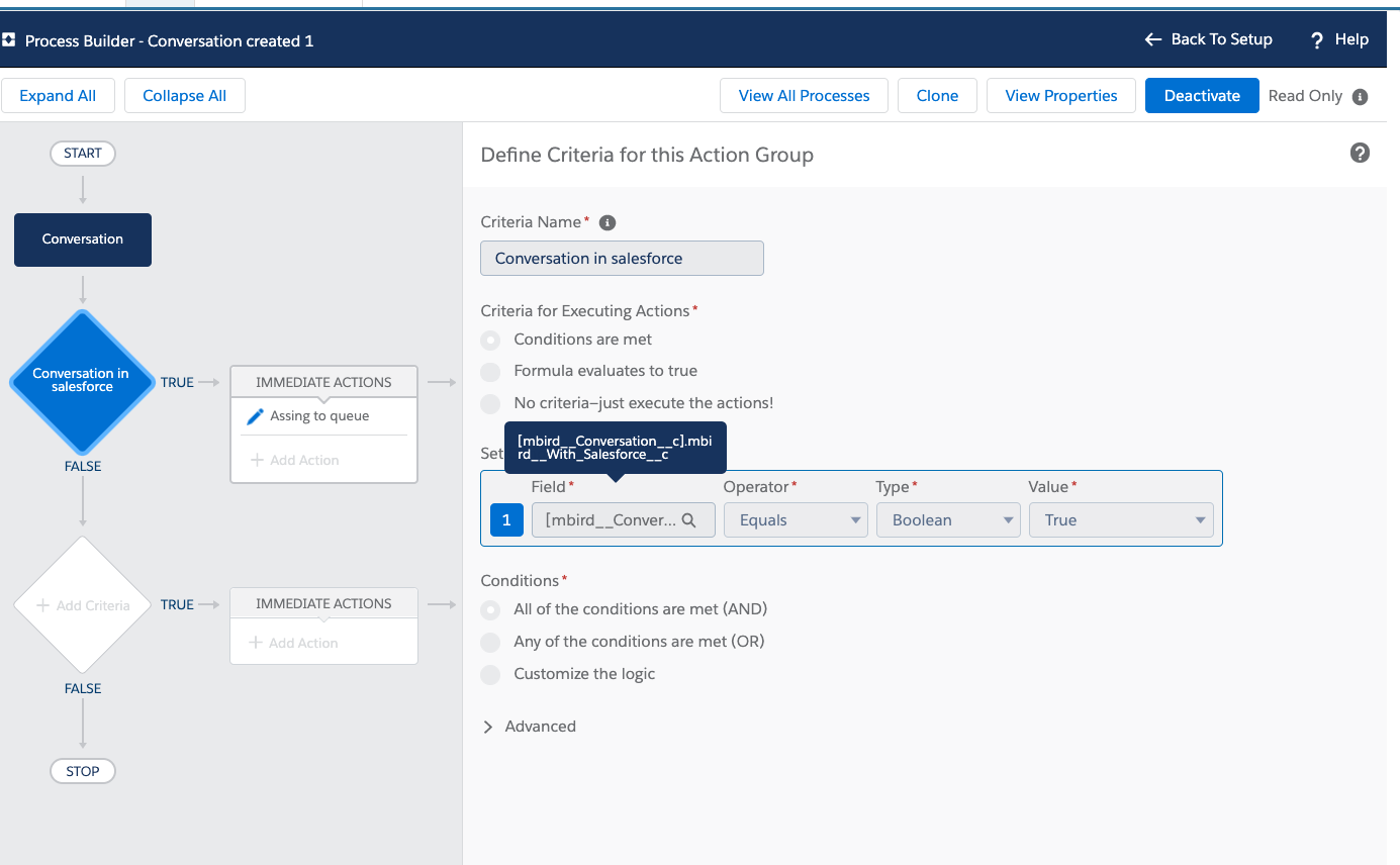 2. In the Salesforce flows or process you have defined to assign conversations to queues and agents add an additional condition, “conversations is in Salesforce”, based on the *with\_Salesforce\_\_c* conversation parameter. By adding this extra condition, we will ensure that the Salesforce agents only get notified once the Flow Builder signaled to Salesforce that conversation automation has ended and an agent must now be notified.<br>