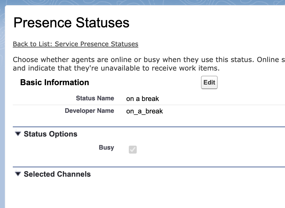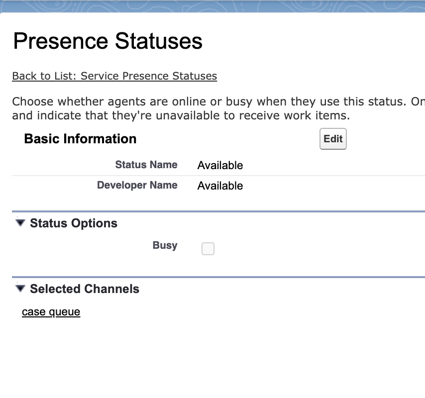 7. Create Presence Statuses in *Omni-channel -> Presence Statuses you will need to create at least 2. One online and assign the Case queue, and one offline.*