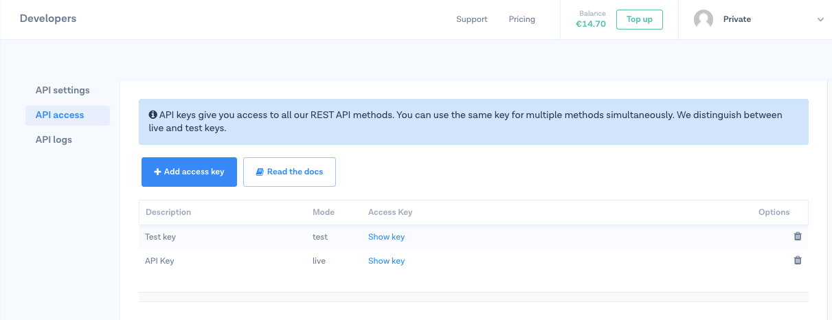 5. To get your **Access Key**, click on **API access**, then select **Show key**. Click **Copy**, and paste this key into the relevant field on the Salesforce configuration page. Please use the **live** mode API Key for product instances of Salesforce.<br>