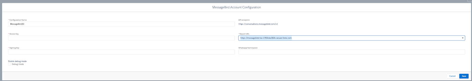 7. In the ReportURL field, enter the force.com site that you created in the [Connect Salesforce to MessageBird](#h_01F4SCC2E6P6SE3BH2S74MZXPE) step.