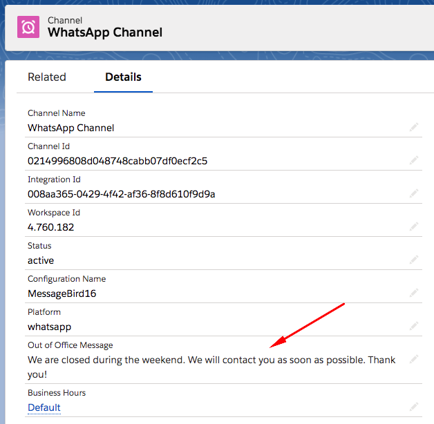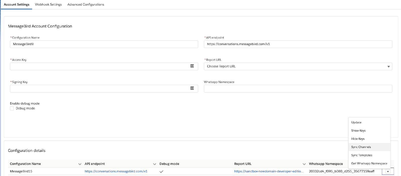 * Sync channels: Synchronizes channel information from MessageBird to the Salesforce plugin. This is a required action when you first set up the connection, and you must repeat it every time a new channel is configured on the MessageBird side.