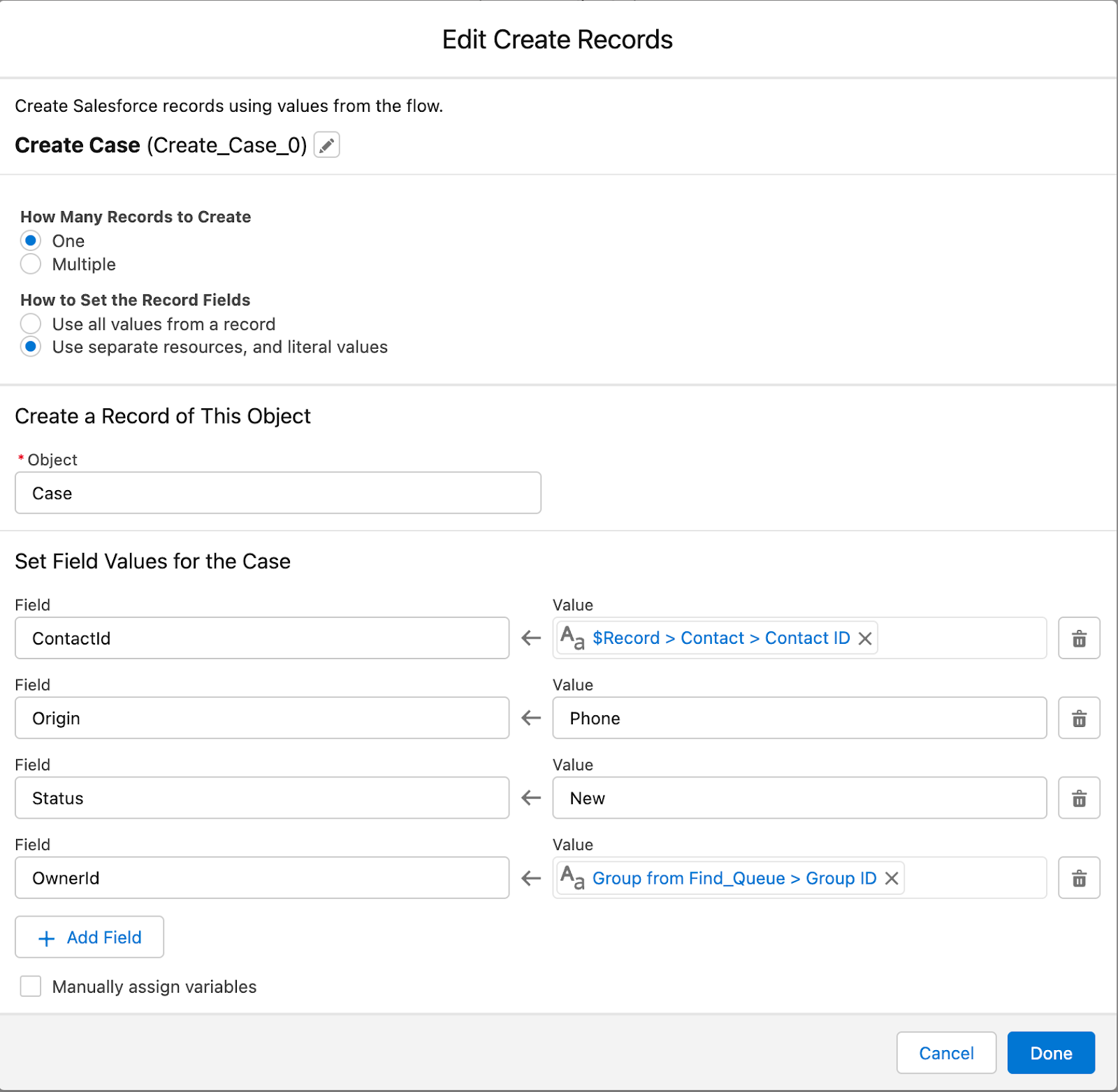 5. In both cases, the case creation should be configured like this, the owner id is the previously retrieved Queue by developer name, and the contact should be the one associated with the conversation<br>