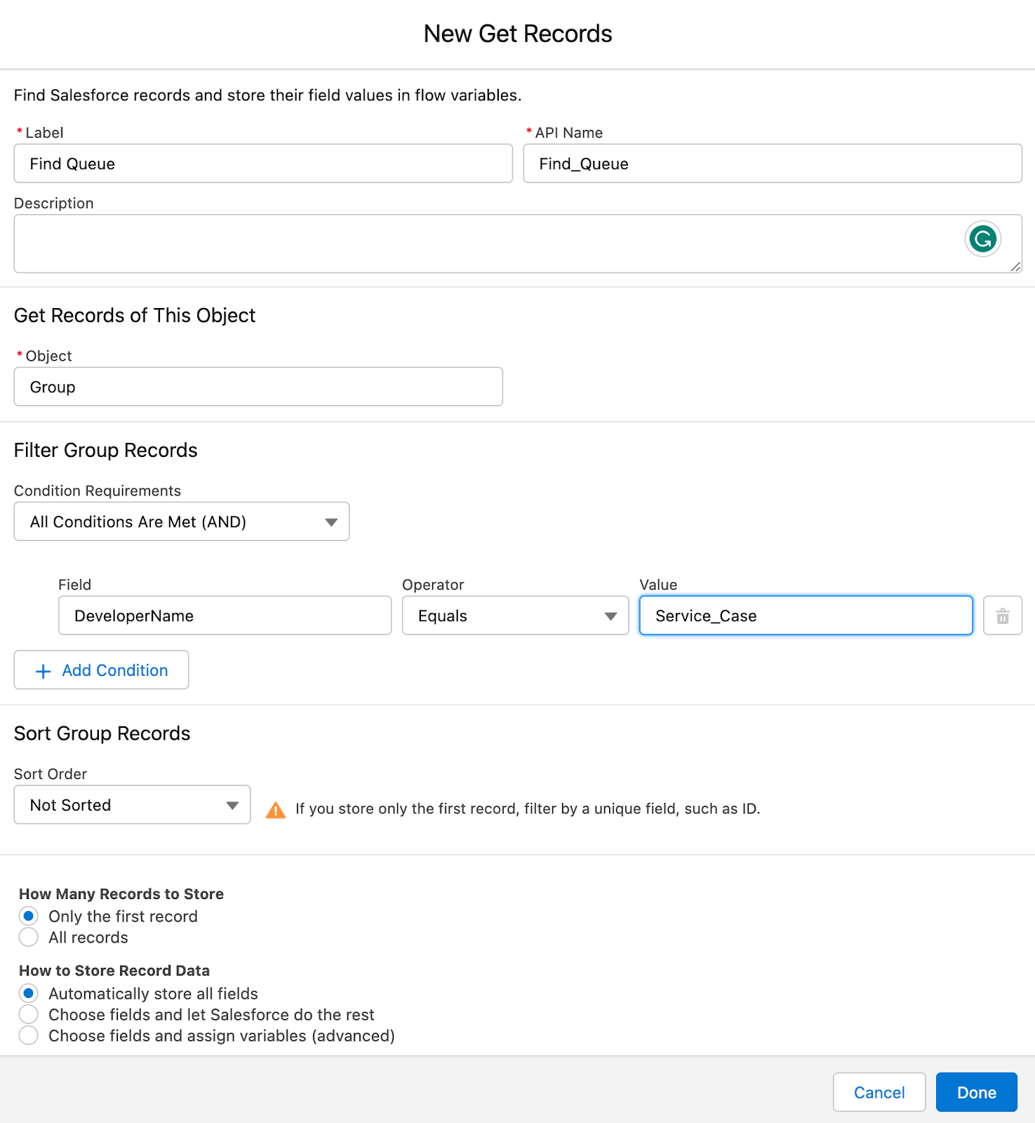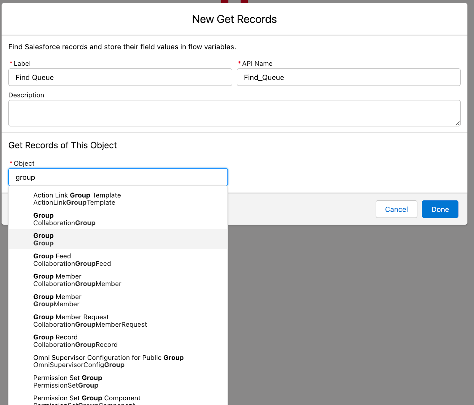 2. You should add a Get Record element add the name Find Queue and add the object \[**Group Group**]