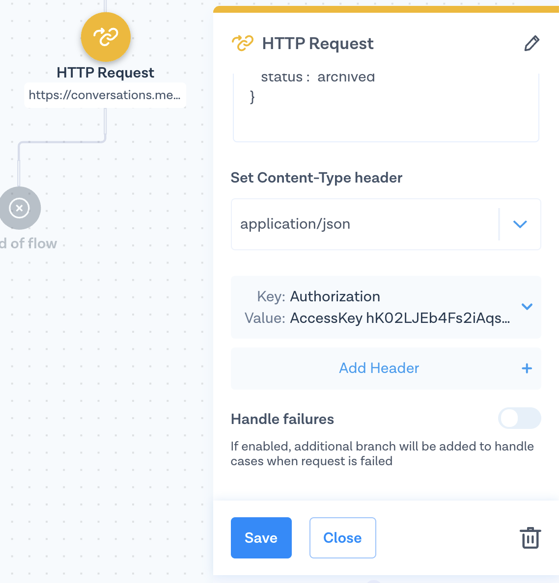 7. On the last **HTTP Request** step, update the **Access Key** used to authorize the request with your sandbox’s live API key.<br>