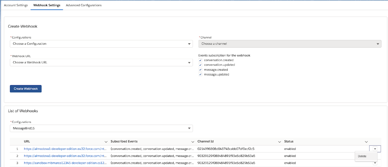 **NOTE:** For a well-functioning system, you’ll need to create a webhook for each channel that you have in your MessageBird account that you want to use in your Salesforce environment.