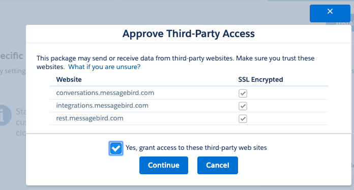 6. A pop-up will open. The pop-up will ask you to confirm that you want to grant third-party access to MessageBird. Make sure all of the boxes are checked, click **Continue** to start the installation to start, and then click **Done**.<br>