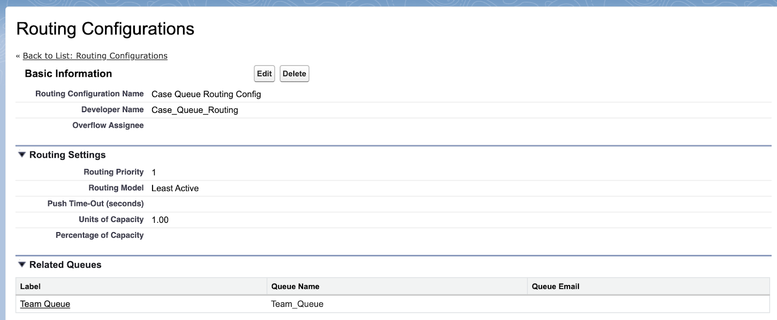4. Create Routing Configurations put the name and developer name, set routing priority to 1, and set *Units of Capacity* to 1.<br>