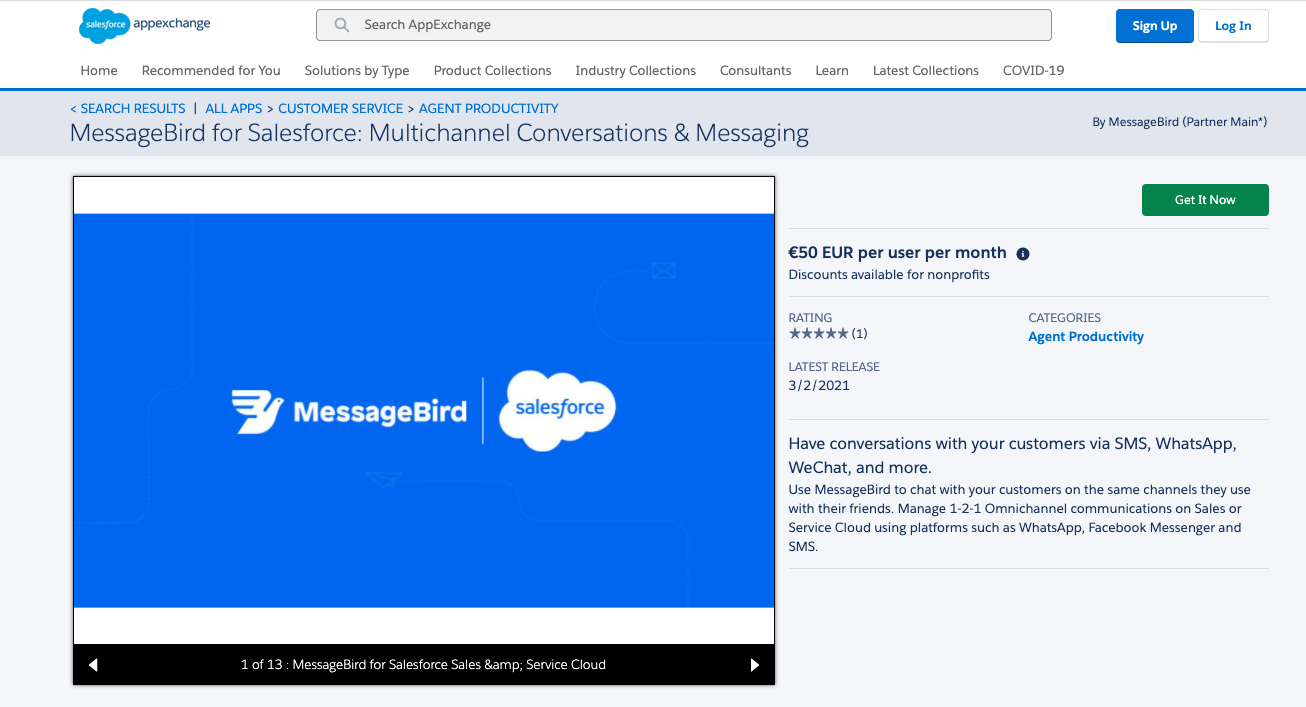1. Go to the [Salesforce AppExchange](https://appexchange.salesforce.com/mktcollections/cloud-collections/MarketingCloud) and search for MessageBird.