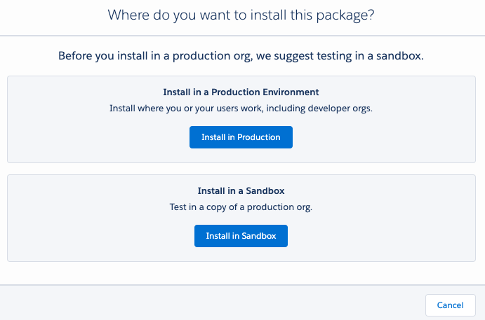 4. A pop-up will open. Choose whether you want to install the MessageBird package in the Sandbox or in the Production environment.<br>