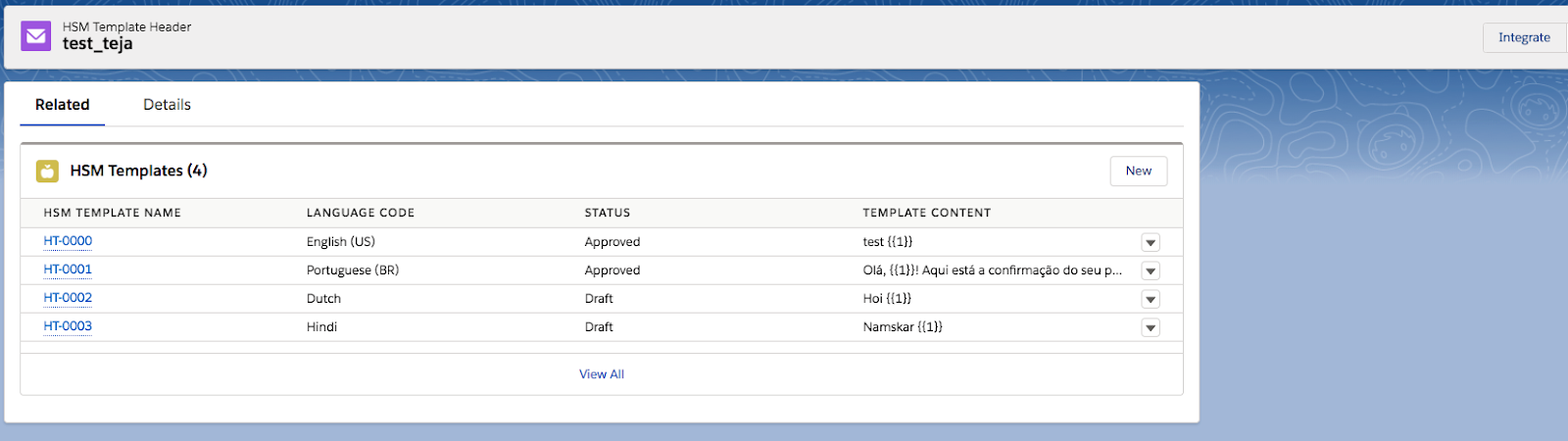 4. Once you’ve created the HSM Template records, click on the **Integrate** quick action on the HSM Template Header page for approval.<br>