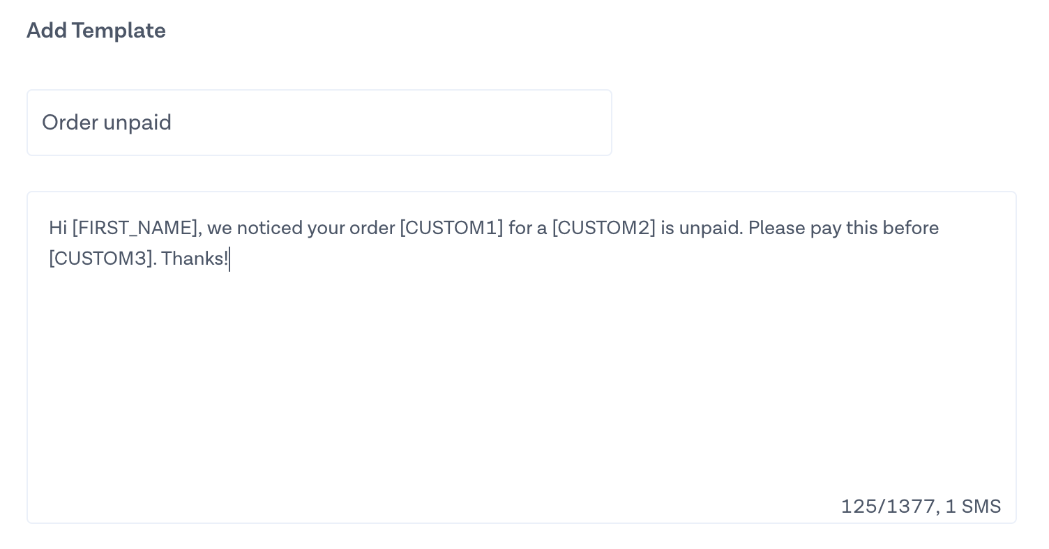 Click [here,](https://dashboard.messagebird.com/en/templates) or click on your Workspace → Settings → Templates → '[Add template](https://dashboard.messagebird.com/en/templates)' in the top-right side of the Dashboard. Give your template a name so you can easily recognise it, now simply write down and personalise the message (read more below on personalisation). When ready, click 'Add' to save your template.