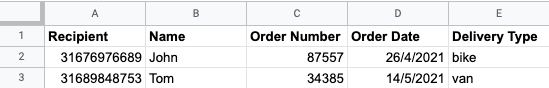 When importing contacts via a file, you can create additional columns containing personal information. For example, in a column named 'Order Number' you can enter the order number for each of your end users. When you import your file, your personalised columns should appear along with other imported information such as the phone number and name. Below we have an example of what your file might look like: