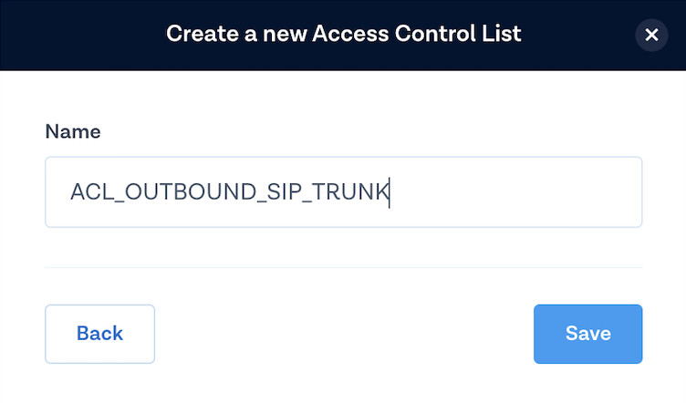 4. A pop-up window will appear. In the Name field, enter a recognizable name for your access control list, e.g. ACL\_OUTBOUND\_SIP\_TRUNK.\ <br>