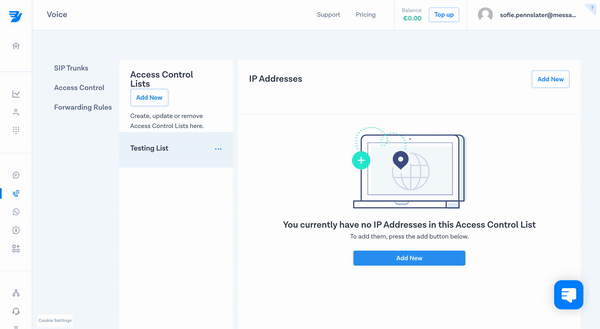 Whitelisting is used in our platform to make sure that the calls terminating on your SIP Trunk are from a trusted source i.e. the IP address(s) defined by you. Unknown IP traffic gets blocked by our SIP servers. You'll add your whitelisted IP addresses when you set up your ACL.