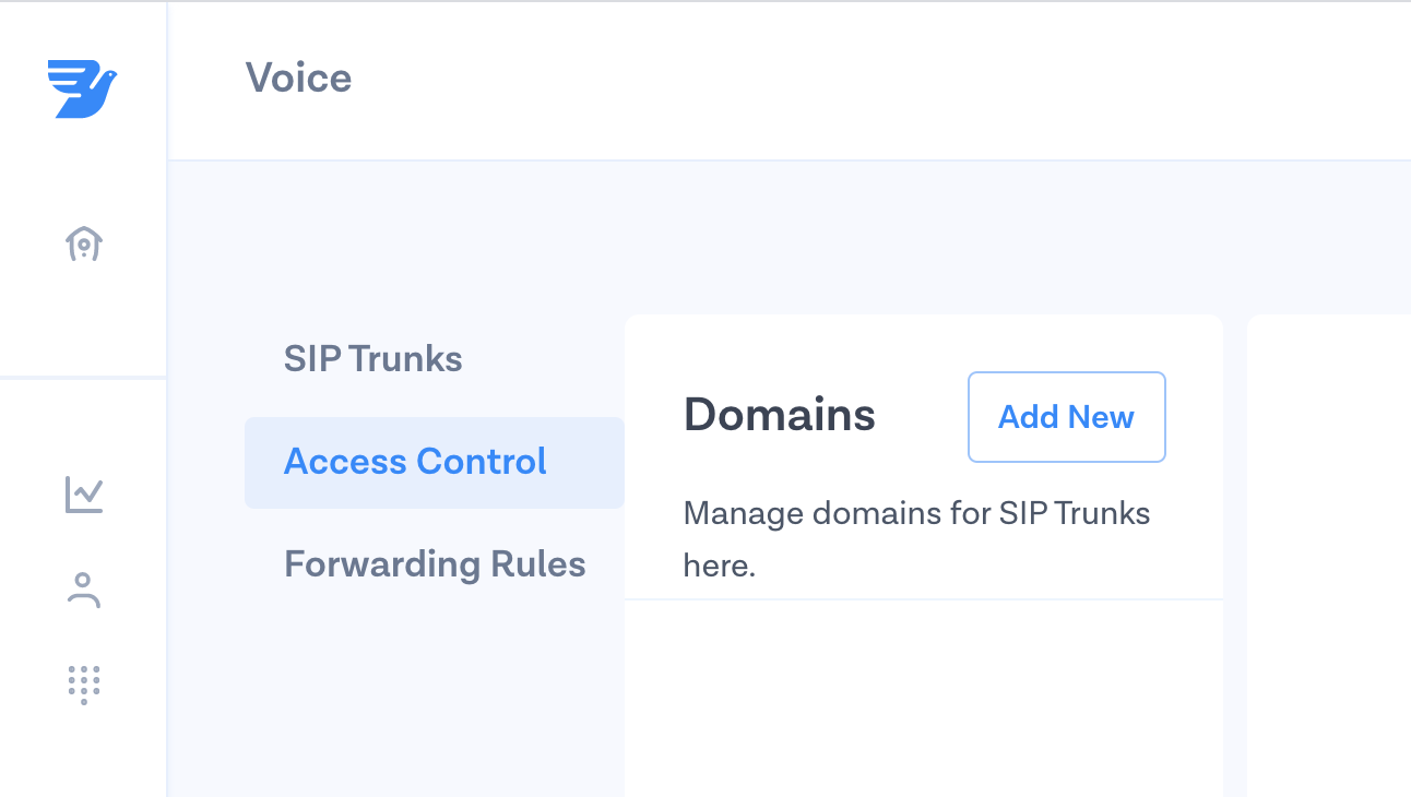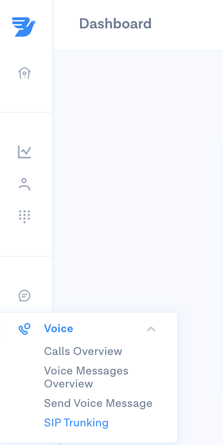 1. Log into your [Dashboard](https://dashboard.messagebird.com/en/login), then click the **Voice** icon on the toolbar on the left-hand side of your screen. Select **SIP Trunking** from the menu that appears.<br>