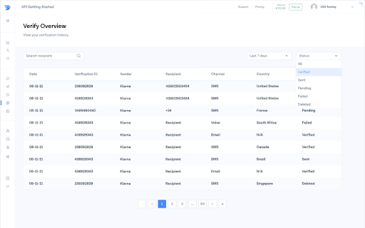 In the overview you will see all verification codes sent from your account, along with information such as the Verification ID, recipient info and which channel was used. You will also be able to see the status of the code and whether or not this has been verified yet.&#x20;