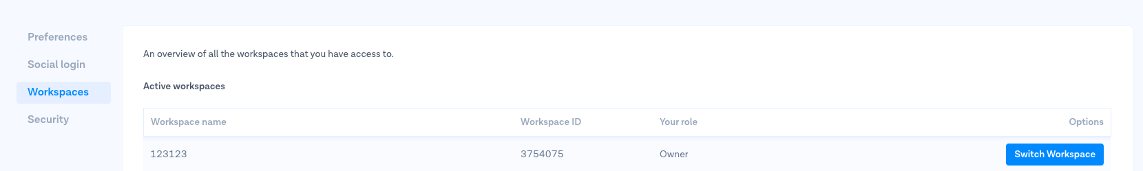 The MessageBird Workspace ID can be found in your [workspace overview.](https://dashboard.messagebird.com/en/account/workspaces) Here you'll see a list of your workspaces, with the workspace ID.&#x20;