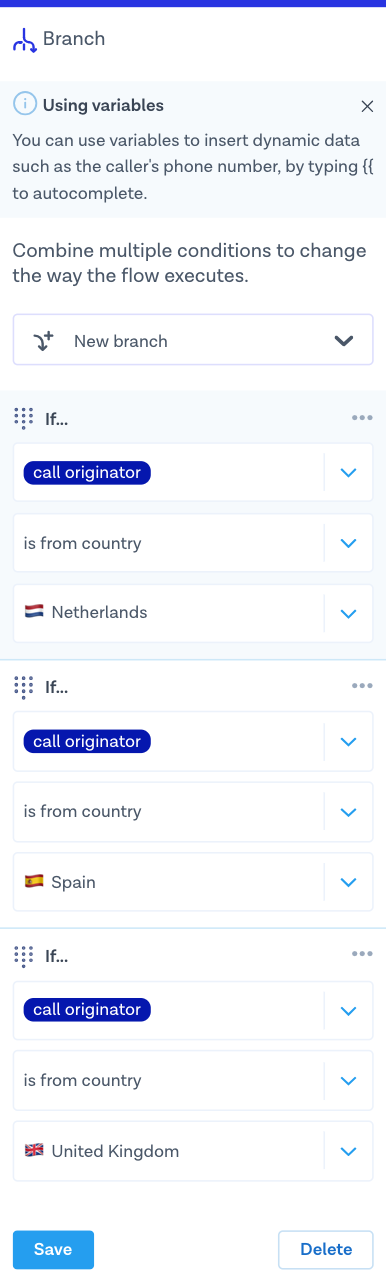 3\. Add as many branches as you need, don't forget to set-up the variables for each. For this example, we will set-up three branches for The Netherlands, Spain and the United Kingdom.