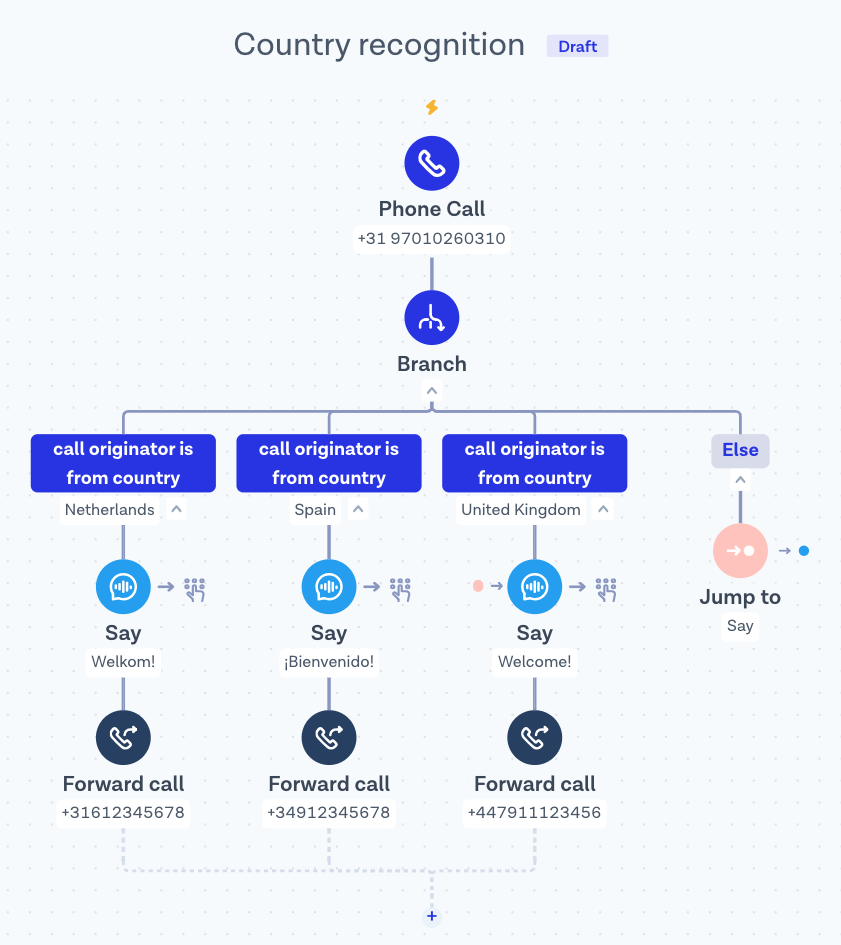 4\. Add the desired response for each branch. For this example, we want to add a 'Say' Step saying 'Welcome' in each language and forward the call to a specific number where an agent who speaks the same language as the client can help him out. If the customer is calling neither from The Netherlands, Spain nor the United Kingdom it will be forwarded to an agent who speaks English since it is the most likely language the customer will know.
