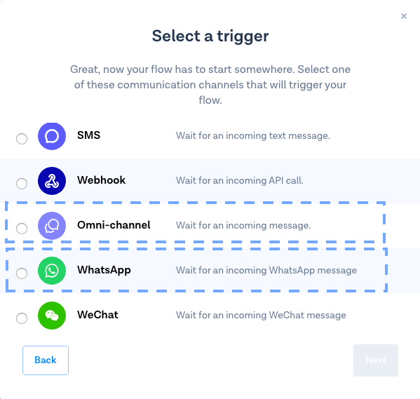 2. Select **Omni-channel** or **WhatsApp** as the trigger.